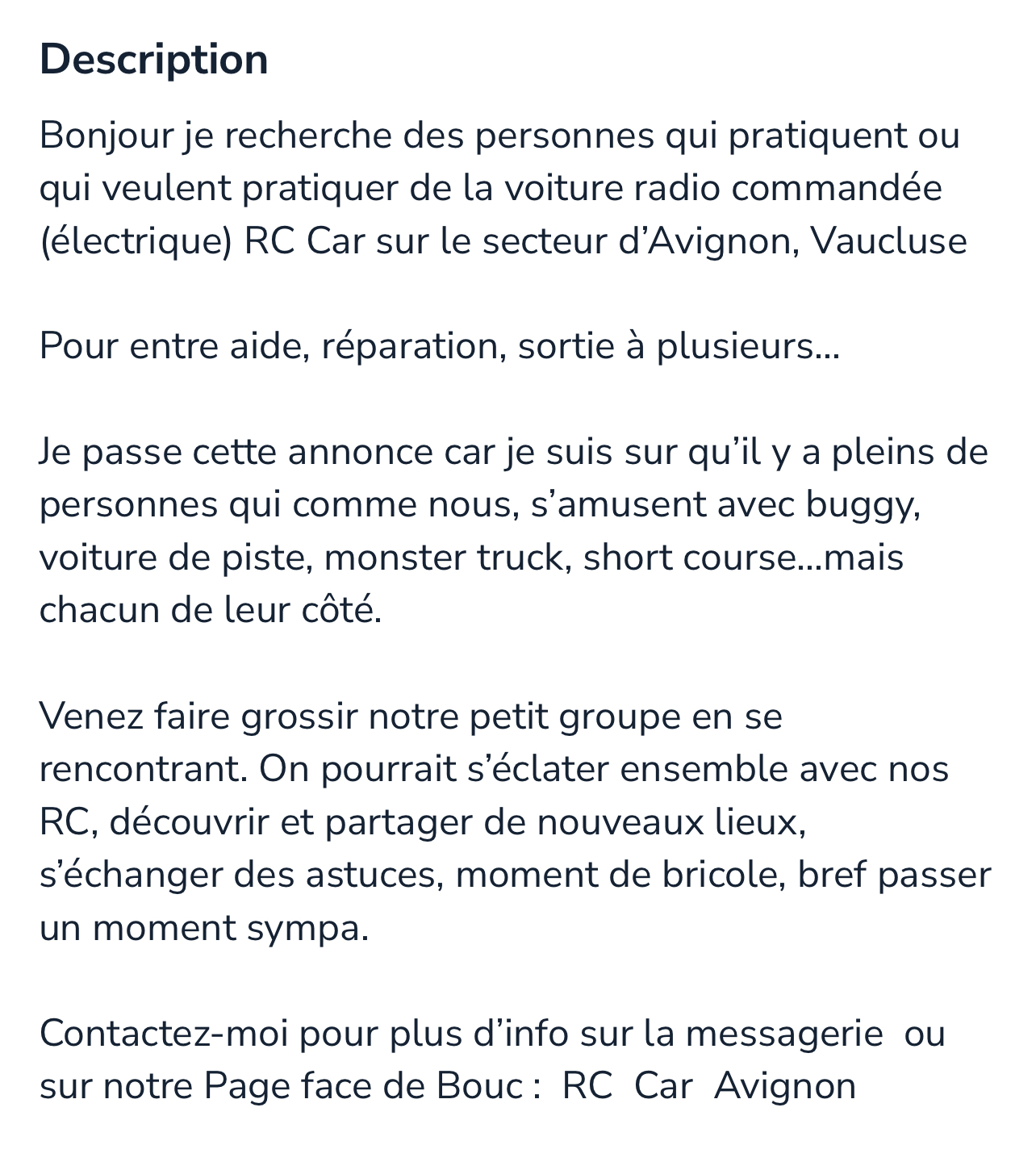 La RC, c'est un monde de passionnés et de partage. Faire des rencontres pour rouler ensemble c'est sympa cela permet aussi de découvrir de nouvelles RC, de partager de nouveaux lieux (c'est la plus grosse difficulté en RC, des lieux pour rouler), s’échanger des astuces et aussi partager des moments de bricolages…